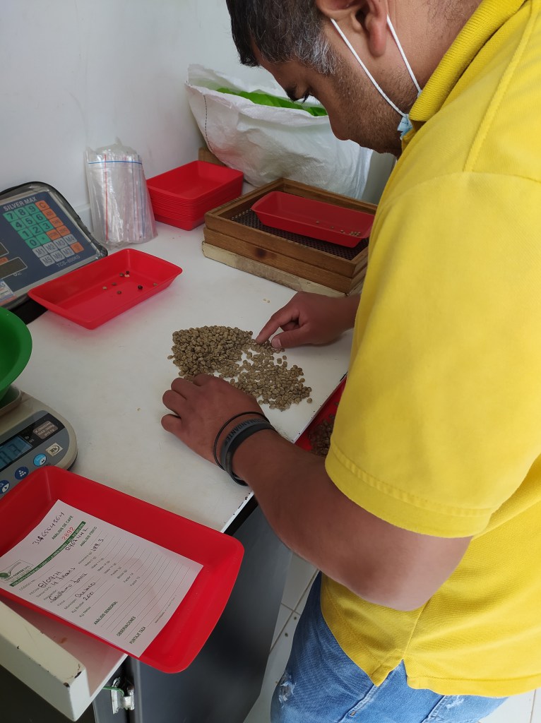 - Sampling and selection at point of arrival: Once the bags of coffee are dropped out at Evelio’s collection center, he retrieves a sample from the bag of 250 grams, which he then carefully selects by discarding grains that could damage the quality of the taste. That is, unripe, smaller-than-normal or overdried grains. Usually Evelio buys pergamin coffee grains, which means that threshing must be done. He first weights the coffee and then removs the pergamin with a threshing machine, after which he weights it again again to retrieve the Performance factor. The factor is obtained by multiplying 70 times 250 and then dividing it by the amount that the coffee weighted after the threshing. He multiplies it by 70 because we want to know the factor if we were to fill a bag of 70 kg of green coffee given a sample of 250 grams. Usually the factors yields a number above 92.