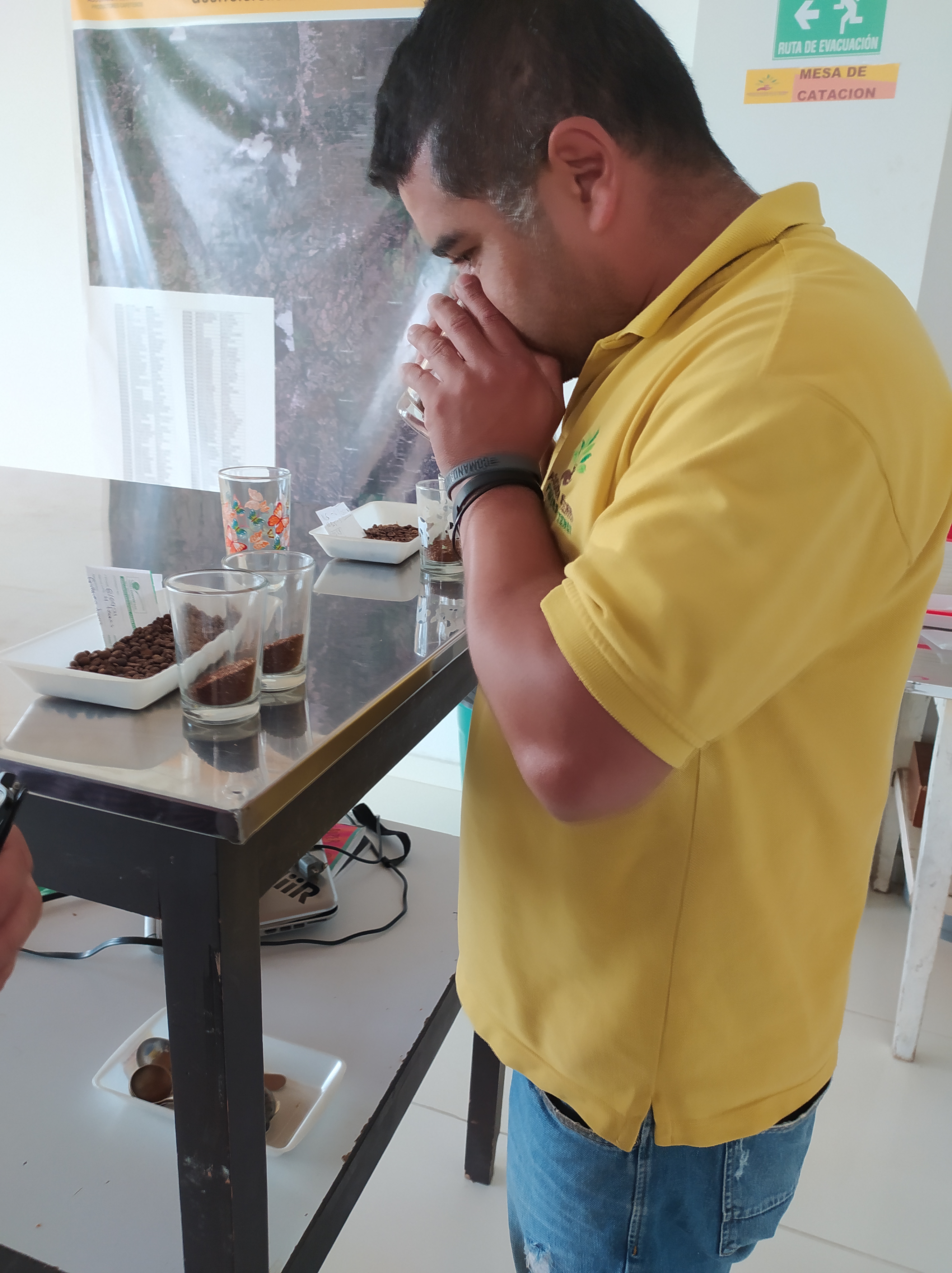Knowledge about coffee can only be acquried in practice. Evelio lazzo, a certified Q-Grader who is able to evaluate the quality of the coffee, volunteered to show the way in which a quality score is given to a coffee his lab to members of the Sarralde family.